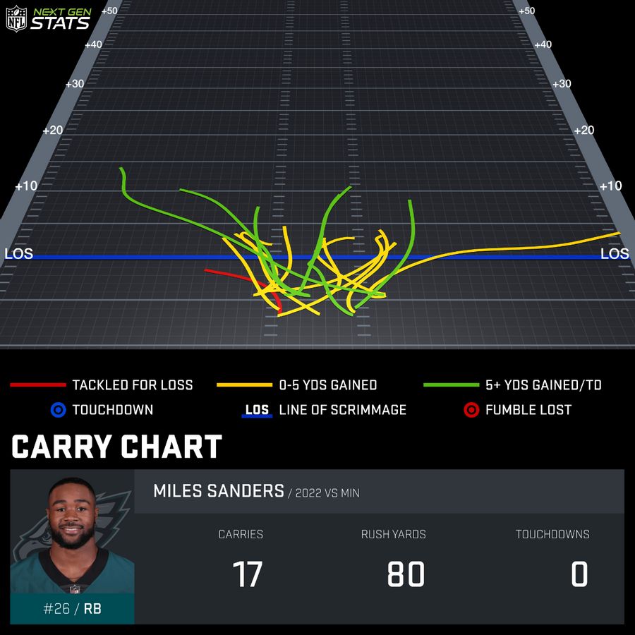 The below carry chart shows where each one of Miles Sanders’ runs went on Monday Night Football in the Eagles win over the Minnesota Vikings.